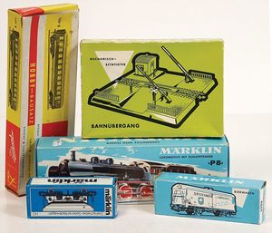 gr. Fundkiste, meist H0, Schlepptenderlok Baureihe 38, einige Güter- u. Personenwagen, Bahnübergang, Zubehörteile, bitte besichtigen