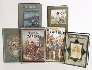 Konv. Kinder- u. Jugendbücher, „Rigikinder und andere Geschichten“ von Toni Schuhmacher, „Heckenröschen“ von M. Giese, „Allerelei Geschichten von Tante Emmy“, „Märchen“ von L. Bechstein, „Onkel Toms Hütte“, „Puppe Wunderhold“ Samtausgabe von H. Cosmar, Buchrücken fehlt